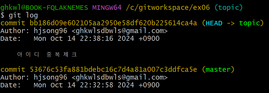 이렇게 git log 를 보면 topic 에 있던 아이디 중복체크가 들어온 것을 확인 가능하다.