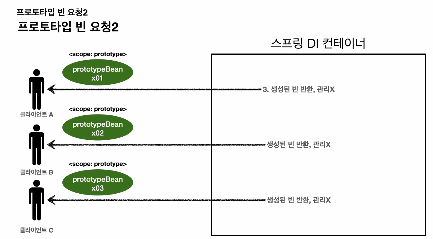 - 스프링 컨테이너는 프로토타입 빈 생성, 의존관계 주입, 초기화까지만 관여