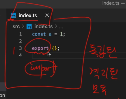 우리 실습은 EsModule 로 진행했기 때문에 export{} 를 넣어주거나,