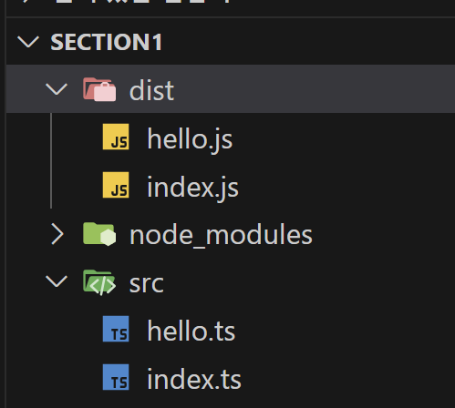 tsc 명령어를 치면 사진과 같이 dist 폴더 안에 JavaScript가 생성된 걸 볼 수 있다. (폴더도 같이 생성됨)