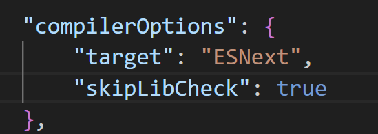 "compilerOptions": { "target": "ESNext", "skipLibCheck": true, "module": "ESNext" },"module": "ESNext"