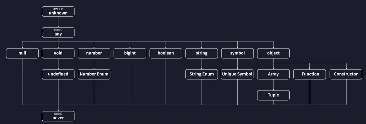 타입스크립트가 제공하는 기본 타입을 계층 구조로 나타내었다.