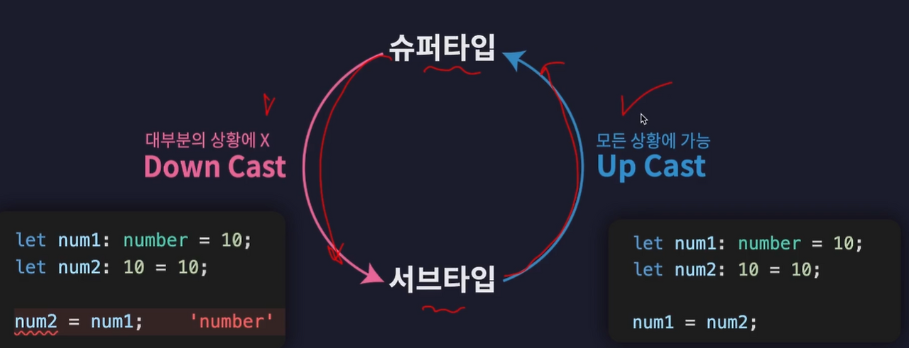 이렇게 슈퍼타입이 서브타입에 포함되는 상황을 다운캐스팅이라 하는데 이는 대부분 상황에서 불가능하다.