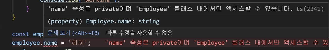class ExecutiveOfficer extends Employee { // 필드 officeNumber: number; constructor(name: string, age: number, position: string, officeNumber: number) { super(name, age, position); this.officeNumber = officeNumber; } //메서드 func() { console.log(`${this.name} working`); //파생클래스에선는 접근 불가! } }private 은 해당클래스에서만 접근이 가능하므로 아무리 파생클래스여도 접근이 불가능하다.